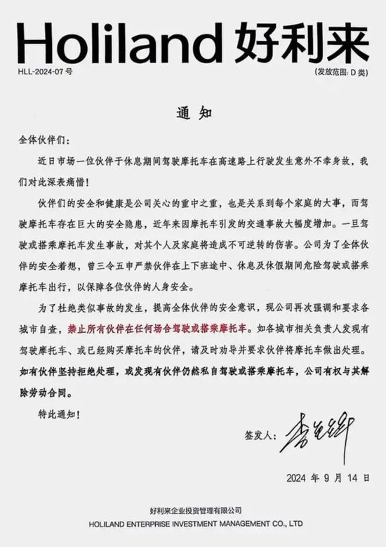 近日,某社交平台上流传一张好利来禁止员工在任何场合驾驶或搭乘摩托车的通知截图。该通知显示,近日,好利来一位员工于休息期间驾驶摩托车发生意外不幸离世,公司为了全体员工的安全着想,严禁员工在上下班途中、休息及休假期间危险驾驶或搭乘摩托车出行。此外,上述通知还称,如果有员工仍私自驾驶或搭乘摩托车,公司有权与其解除劳动合同。
