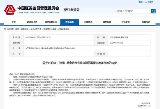 证监会浙江监管局:对蚂蚁(杭州)基金销售公司采取责令改正措施