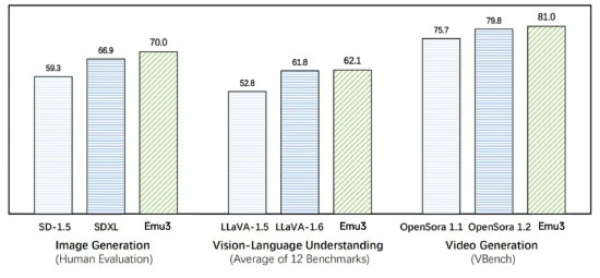在图像生成、视觉语言理解、视频生成任务中,Emu3的表现超过了 SDXL 、LLaVA-1.6、OpenSora等知名开源模型。在图像生成任务中,人类评估得分Emu3高于SD-1.5与SDXL;在视觉语言理解任务中,12 项基准测试的平均得分,Emu3领先于LlaVA-1.6与LlaVA-1.5;在视频生成任务中,VBench基准测试得分,Emu3优于OpenSora 1.2。
