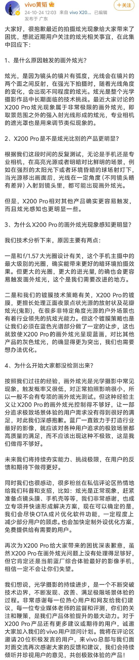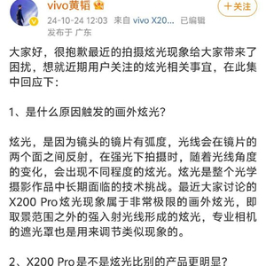vivo副总裁就X200 Pro眩光问题道歉:会尽快OTA成片优化软件功能