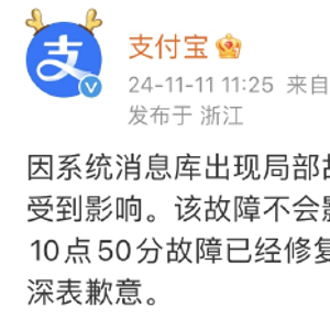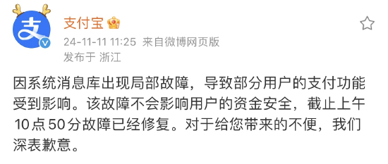 11月11日上午,支付宝在其官方微博回应称:因系统消息库出现局部故障,导致部分用户的支付功能受到影响。该故障不会影响用户的资金安全,截止上午10点50分故障已经修复。对于给您带来的不便,我们深表歉意。