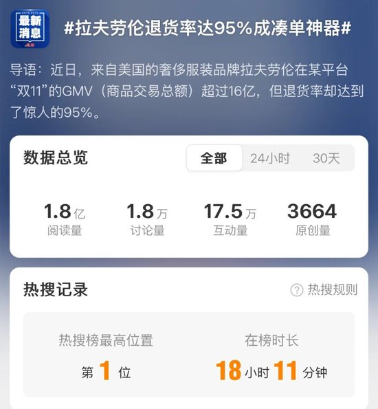 11月7日,@新华报业网 报道称:“美国时尚品牌Ralph Lauren拉夫劳伦在淘宝双11GMV超过16亿,但退货率高达95%。”