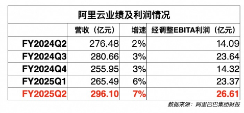 据业绩报告,本季度,阿里云收入296.1亿元,同比增长7%,对比上一季度265.49亿元,环比增长11.5%;在利润表现方面,阿里云经调整后EBITA利润同比增长89%,达到26.61亿元,超越分析师预期的24.93亿元。