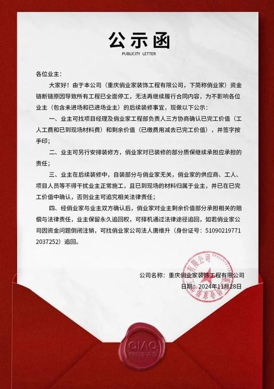 12月1日,俏业家装饰发布公示函称,公司资金链断链原因导致所有工程已全面停工,无法再继续履行合同内容,为不影响各位业主(包含未进场和已进场业主)的后续装修事宜,现做以下公示: