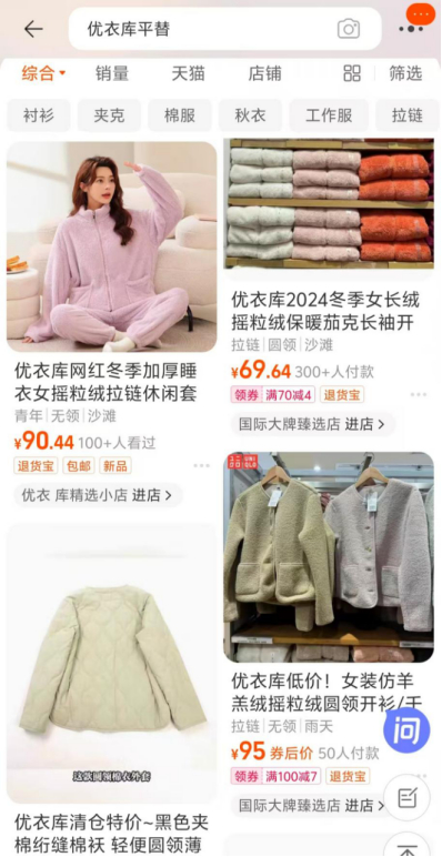 与此同时,在激烈的市场竞争中,“平替”之风已经吹向优衣库,并对其品牌和销量构成了实质性的冲击。在社交平台上,有关“优衣库平替店铺”的帖子应接不暇,从平替店铺到代工厂,399的羽绒服100元左右就能拿下,曾以价格亲民著称的优衣库,在中国市场正逐渐丧失性价比的优势。