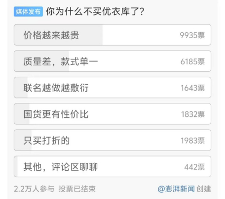 今年7月,有媒体在微博上做了一个调查——你为什么不买优衣库了?其中,近1万人投了“价格越来越贵”这个选项,“嫌贵”成为大家最大的理由。