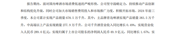 进入2024年后,靠提价维持增长的局面消失了。2024年前三季度,青岛啤酒销量679万千升,由于没有单独披露啤酒收入,以营收计算,每千升收入为4268元,千升酒营收同比增长0.49%。