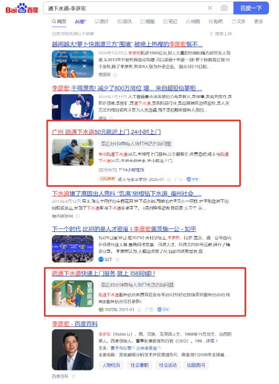 (搜索关键词“通下水道-李彦宏”,搜索结果有广告但数量减少)