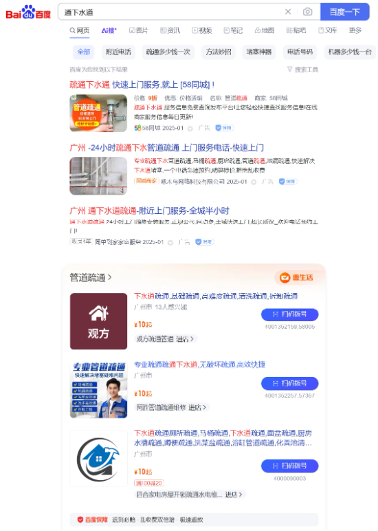 (搜索关键词“通下水道”,首页前5条搜索结果均为广告)