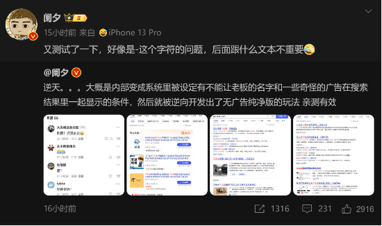 新浪科技从相关技术专家处了解到,“搜索系统在召回和展示内容时,最看重的是结果与搜索词的相关性、质量、时效性。其中相关性是重中之重,当在搜索词后面添加特殊字符时,搜索词的结构就发生了变化,这样和广告的匹配度就会大大降低,广告的展示顺序自然就往后移了。这不是什么神奇的操作,只是改变了搜索词的形态,影响了系统对相关性的判断而已。此外,广告投放偏好,只会买自身相关、搜索量高的词,而不会买后面带有人名的词。”