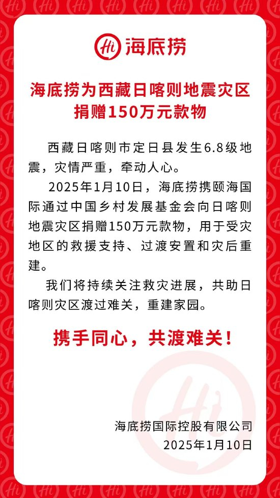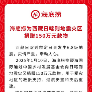海底捞捐赠150万元款物 驰援西藏日喀则地震灾区