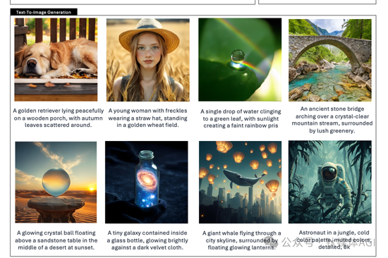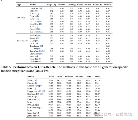 Janus-Pro-7B 在 GenEval 上获得了 80% 的总体准确率,这优于所有其他统一或仅生成的方法,例如 Transfusion (63%) SD3-Medium (74%) 和DELLE-E 3 (67%)。这表明我们的方法具有更好的指令跟踪能力。另外,Janus-Pro 在 DPG-Bench 上获得了 84.19 的分数,超过了所有其他方法。这表明 Janus-Pro 擅长遵循密集的指令来生成文本到图像。