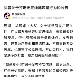 2月8日上午,抖音发布公告称,近期,徐熙媛(大S)女士逝世引发广泛关注,广大网友纷纷表达哀思悼念,希望逝者能够安息。但也有部分账号借机炒作,发布谣言,违背公序良俗和道德底线,不尊重逝者及家属,也伤害了公众感情。对此类行为,我们坚决予以打击,现对“我是夏小健”、“张兰·俏生活”、“张兰之箖玥甄选”、“汪小菲”账号予以无限期封禁。