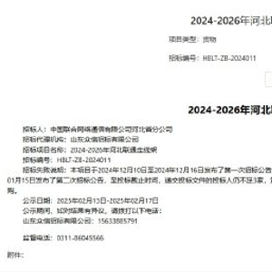 就招标失败原因,中国联通表示,本项目于2024年12月10日至2024年12月16日发布了第一次招标公告,至投标截止时间,递交投标文件的投标人不足3家,第一次招标失败;2025年01月09日至2024年01月15日发布了第二次招标公告,至投标截止时间,递交投标文件的投标人仍不足3家,第二次招标失败。本项目经过两次招标均失败,故招标人将对第二次递交投标文件的投标人进行采购。