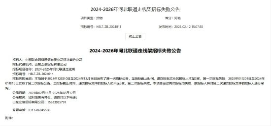 2月12日,中国联通发布《2024-2026年河北联通走线架招标失败公告》。