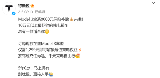 2月5日,特斯拉在春节假期后第一天宣布即日起至2月28日,Model 3全系车型限时享受8000元保险补贴,补贴后最低售价仅22.75万元/辆。同时,购车用户还可享受5年0息贷款政策及特享充电权益。