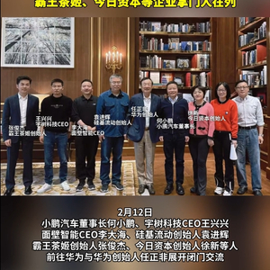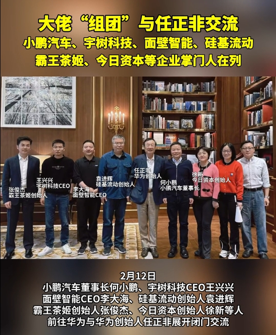 据澎湃新闻报道,2月12日,小鹏汽车董事长何小鹏、宇树科技CEO王兴兴、面壁智能CEO李大海、硅基流动创始人袁进辉、霸王茶姬创始人张俊杰等人前往华为,与任正非展开闭门交流。