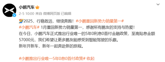2月5日,小鹏推出“5年0息0首付”政策,覆盖小鹏X9、小鹏G9、小鹏P7i、小鹏G6车型,通过该方式购车的最高利息补贴达到5.7万元。