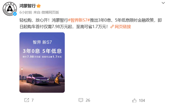 值得注意的是,2月12日,鸿蒙智行宣布,智界新S7推出3年0息、5年低息的限时金融政策,首付7.98万元起,最高可省1.7万元。这是鸿蒙智行在2025年首次推出促销措施。