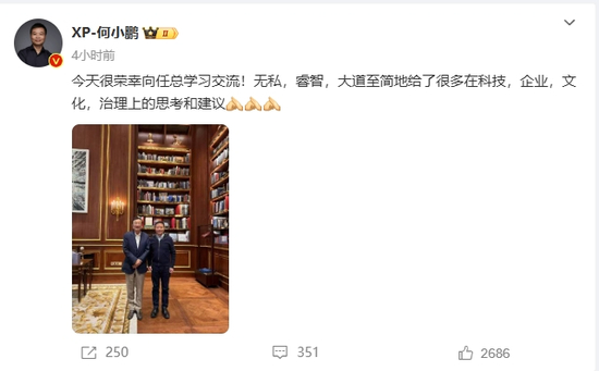 小鹏汽车董事长何小鹏12日在社交平台发布了一张与任正非的合照,他表示:“今天很荣幸向任总学习交流!无私,睿智,大道至简地给了很多在科技,企业,文化,治理上的思考和建议。”