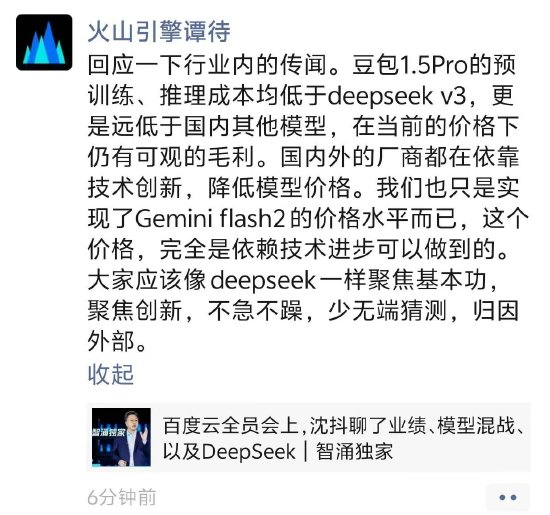 新浪科技讯 2月13日下午消息,百度智能云事业群总裁沈抖在全员会上表示,“国内大模型去年‘恶意’的价格战,导致行业整体的创收相较于国外差了多个数量级”。对此,火山引擎总裁谭待通过朋友圈回应称,“大模型降价是通过技术创新实现的,大家应像DeepSeek一样聚焦基本功,少做无端猜测。”