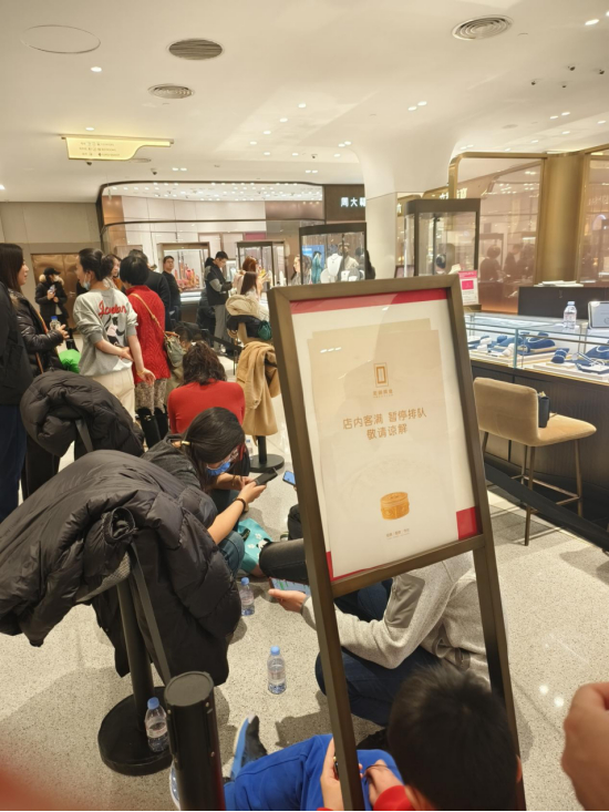 2月13日,距离SKP情人节活动还剩1天,北京SKP老铺黄金门口人满为患,不少人带着小马扎,下午1点左右队尾就摆放出了“店内客满,暂停排队,敬请谅解”的告示牌。