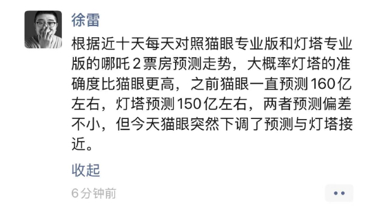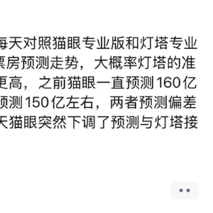 他解释说,“之前猫眼一直预测160亿左右,灯塔预测150亿左右,两者预测偏差不小,但今天猫眼突然下调了预测,与灯塔接近”。
