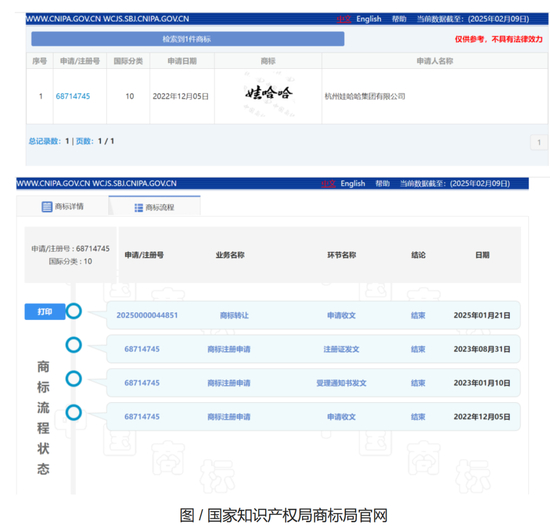 据国家知识产权局商标局官网,娃哈哈集团正对“娃哈哈”系列商标进行转让,目前“申请收文”环节已结束,申请日期为2025年1月21日。