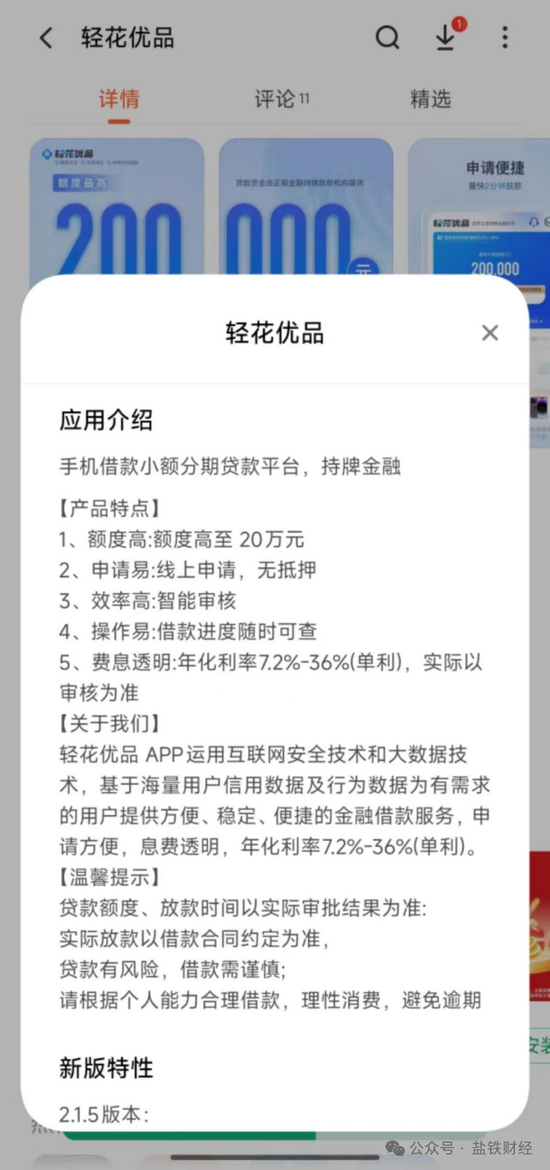 在这场隐秘的“利率游戏”中,结合媒体的报道,盐铁财经最近发现,一款名为轻花优品的助贷APP即是一个典型样本——36%的超高利率的同时,还在很多借款人不容易发觉的情况下扣除“会员费”“担保咨询费”等费用,极大推高了借贷人的借款成本。