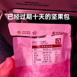 网友发布的图片显示,一包坚果零食的包装袋上写有“吉祥航空”字样,生产日期为“2024年8月13日”,保质期则为“6个月”。在发布这张图片时,该网友还配文写道:“已经过期十天的坚果包。”
