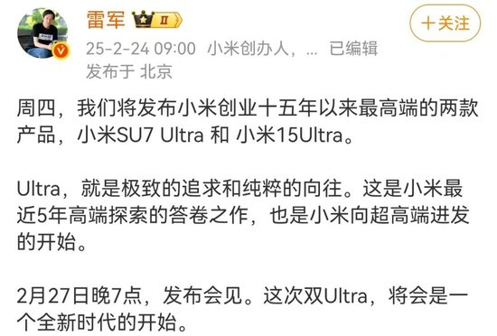 此前,在2月24日,雷军就曾发文称,Ultra,就是极致的追求和纯粹的向往。这是小米最近5年高端探索的答卷之作,也是小米向超高端进发的开始。2月26日,雷军在微博发文称,“喜欢Ultra的朋友,可以先下载小米汽车App提前小定,发布后将会优先排产。”据悉,2月27日,小米将召开新品发布会,届时小米SU7 Ultra 和 小米15Ultra两款产品将发布。根据小米汽车官方规划,小米SU7 Ultra目前已开启预定,预售价81.49万元。