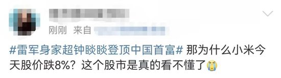 据中国基金报,小米股价盘中一度涨超4%,这一强势表现不仅刷新了小米集团股价的历史纪录,也使其创始人雷军的财富水涨船高,成功超越农夫山泉创始人钟睒睒,成为中国新首富。不过此后小米股价快速跳水,截至午盘收盘,股价下跌7.73%。不少网友评论称:“看不懂了”。