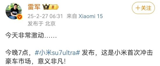 早上7点左右,雷军先是表示:“今天非常激动……今晚7点,小米SU7 Ultra发布,这是小米首次冲击豪车市场,意义非凡!”