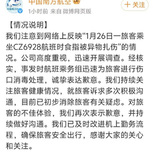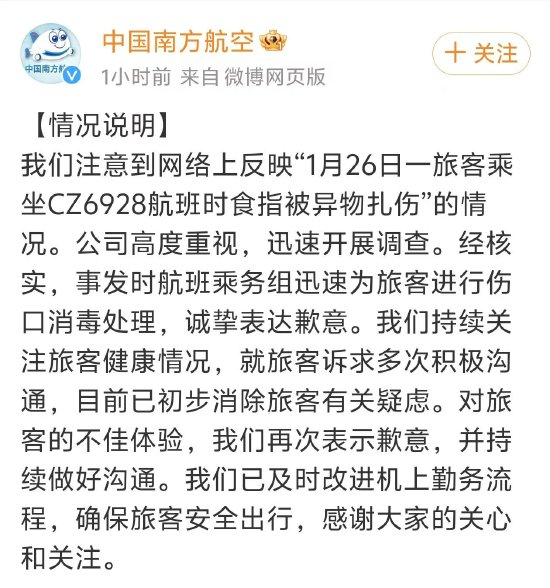 新浪科技讯 2月28日晚间消息,南方航空官方微博发布声明称:我们注意到网络上反映“1月26日一旅客乘坐CZ6928航班时食指被异物扎伤”的情况。公司高度重视,迅速开展调查。经核实,事发时航班乘务组迅速为旅客进行伤口消毒处理,诚挚表达歉意。我们持续关注旅客健康情况,就旅客诉求多次积极沟通,目前已初步消除旅客有关疑虑。对旅客的不佳体验,我们再次表示歉意,并持续做好沟通。我们已及时改进机上勤务流程,确保旅客安全出行,感谢大家的关心和关注。