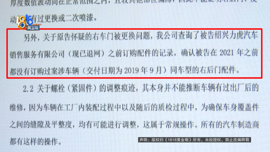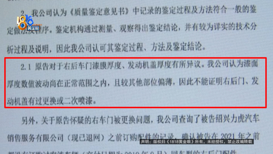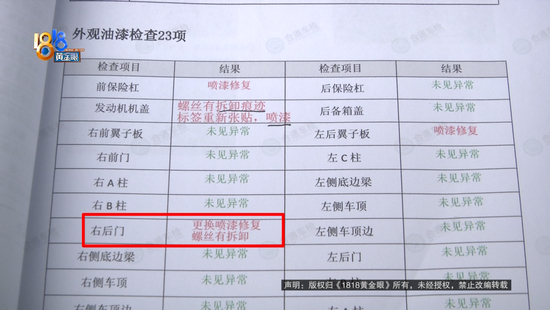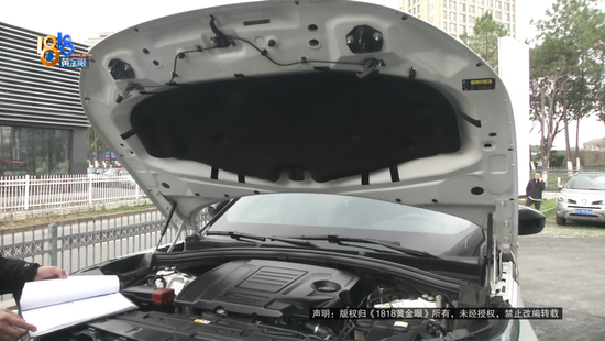 张先生:引擎盖前半部分有局部喷漆,这个标签有重新张贴的痕迹。他们就是不承认,一直拖,推卸责任,对我的检测结果,他们也是矢口否认的。