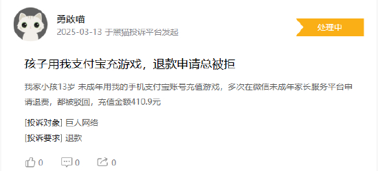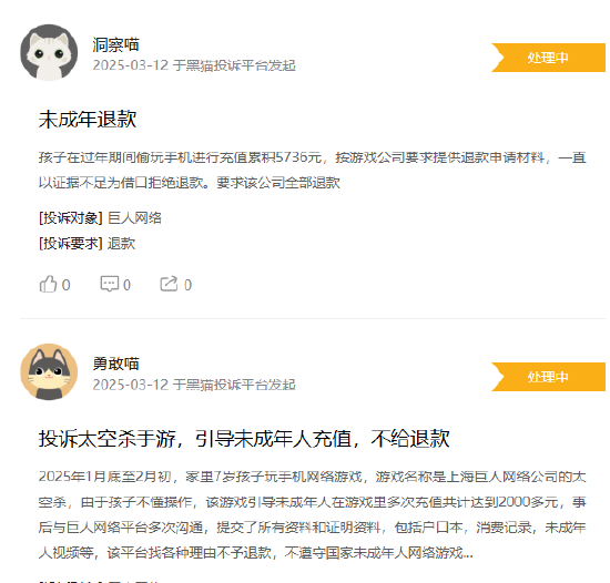 也有用户称,在2025年1月底至2月初,家里7岁孩子玩手机网络游戏,即巨人网络公司的太空杀,引导未成年人在游戏里多次充值共计2000多元,事后与巨人网络平台多次沟通,提交了所有资料和证明资料,包括户口本,消费记录,未成年人视频等,该平台找各种理由不予退款。