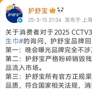3月16日,关于消费者对于2025 CCTV315晚会曝光翻新卫生巾的询问,护舒宝3月15日晚间微博发文回应称,晚会曝光品牌完全不涉及护舒宝。