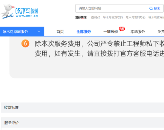 以啄木鸟维修为例,在其家电维修官网的电视、冰箱、空调等不同品类服务详细信息的“收费标准”一栏,均为空白,平台未给出合理、可参照的收费标准,客观上给予了线下乱收费行为的实施空间。