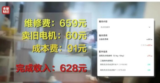 培训经理表示,上门维修人员最重要的任务,就是想尽办法在服务过程中提高收费。如果客户嫌贵,就可以表演一出“双簧戏”给顾客看。两天的入职培训课程结束之后,央视记者跟着公司安排的黄师傅去给一位客户更换洗衣机的电机。这一单,黄师傅收了客户659元维修费,换下来的电机卖了60元,成本只有购买塑料电机的91元。