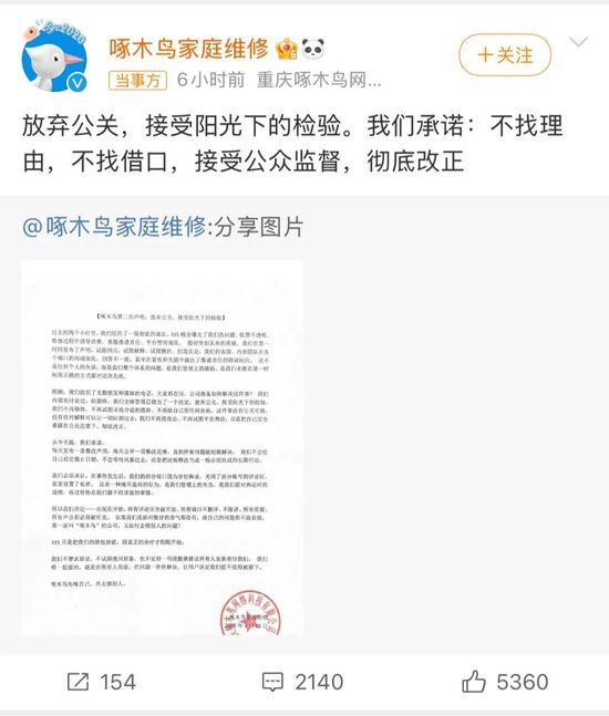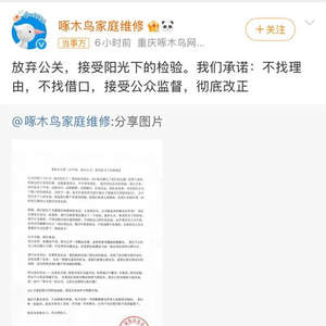 啄木鸟家庭维修称,公司将不再修饰、不再试图寻找合适的措辞、不再给自己留任何余地。这件事没有公关可做,没有任何解释可以让一切回到过去,同时也不再找理由,不再试图平息舆论,而是把自己完全暴露在公众监督下,彻底改正。