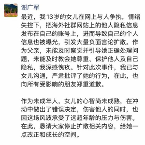 谢广军表示:“我13岁的女儿在网上与人争执,情绪失控下,把海外社群网站上的他人隐私信息发布在自己的账号上,进而导致自己的个人信息也被曝光,引发大量负面言论扩散。作为父亲,未能及时察觉并引导她正确处理问题,未能及时教会她尊重、保护他人及自己隐私,深感愧疚,向所有受影响的朋友郑重道歉。”