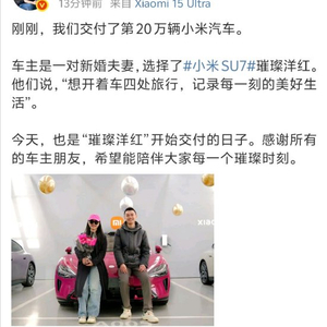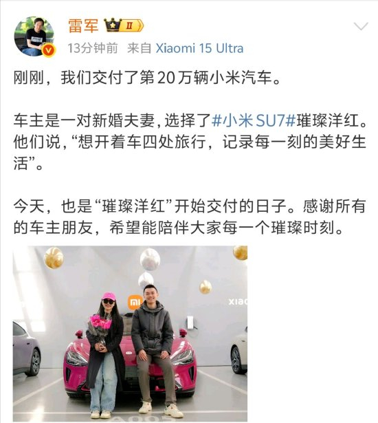 新浪科技讯 3月18日下午消息,小米集团董事长兼CEO雷军微博发文表示,“刚刚,我们交付了第20万辆小米汽车”。他表示,车主是一对新婚夫妻,选择了小米SU7璀璨洋红,今天也是“璀璨洋红”开始交付的日子。感谢所有的车主朋友,希望能陪伴大家每一个璀璨时刻。