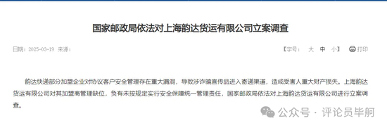 3月19日,据国家邮政局网站报道,韵达快递部分加盟企业对协议客户的安全管理存在重大漏洞,导致涉及诈骗的宣传品进入寄递渠道,造成受害人重大财产损失。上海韵达货运有限公司对其加盟商管理缺位,负有未按规定实行安全保障统一管理的责任,国家邮政局依法对上海韵达货运有限公司进行立案调查。