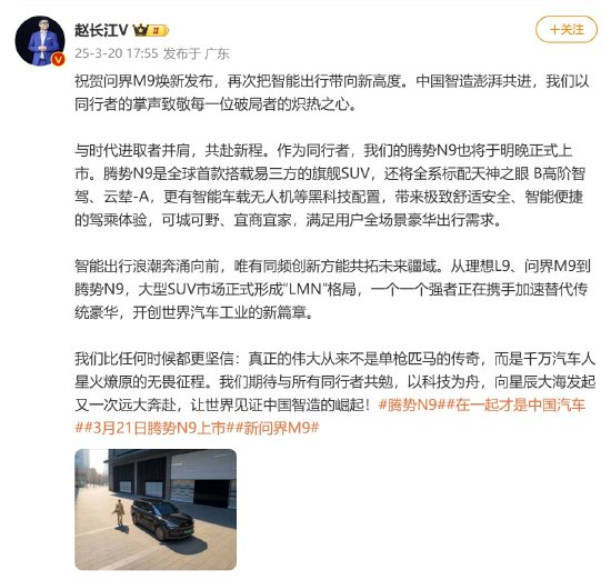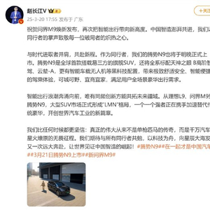 他还表示,作为同行者,我们的腾势N9也将于明晚正式上市。腾势N9是全球首款搭载易三方的旗舰SUV,还将全系标配天神之眼 B高阶智驾、云辇-A,更有智能车载无人机等黑科技配置,带来极致舒适安全、智能便捷的驾乘体验,可城可野、宜商宜家,满足用户全场景豪华出行需求。智能出行浪潮奔涌向前,唯有同频创新方能共拓未来疆域。从理想L9、问界M9到腾势N9,大型SUV市场正式形成“LMN”格局,一个一个强者正在携手加速替代传统豪华,开创世界汽车工业的新篇章。我们比任何时候都更坚信:真正的伟大从来不是单枪匹马的传奇,而是千万汽车人星火燎原的无畏征程。我们期待与所有同行者共勉,以科技为舟,向星辰大海发起又一次远大奔赴,让世界见证中国智造的崛起。(罗宁)