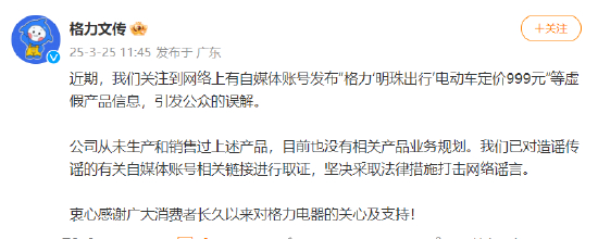 3月25日消息,格力文传中午发布微博表示,近期,我们关注到网络上有自媒体账号发布“格力‘明珠出行’电动车定价999元”等虚假产品信息,引发公众的误解。