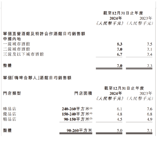 另一方面,海伦司新开拓的加盟店需要时间培育市场,初期运营效率较低。财报数据显示,2024年,“嗨啤合伙人”加盟店的日均销售额仅为5000元,远低于直营酒馆和特许合作酒馆的7000元。