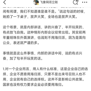 同时,他还说道,“对于格力这样的制造业而言,不太愿意用海归也是很正常。他们需要的人才,海归的不多。现在做这些相关的工作,优秀的人才都在中国,从海外学不到什么相关的知识,海外这样的企业也很少。董明珠不止一次的表示这样的意见,很大程度她就是这么看的,这种看法不是什么歧视,这种看法就是企业管理中积累出来的。”