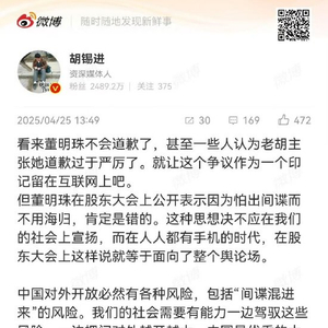 4月25日,日前胡锡进发布视频针对董明珠“海归派”言论发表看法:“董明珠应该道歉,希望她听得进批评。”