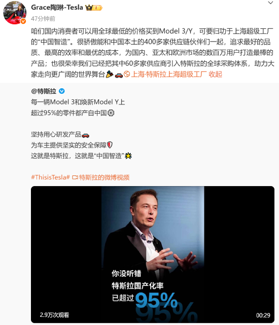 其后,特斯拉公司副总裁陶琳转发视频,并发文表示,国内消费者可以用全球最低的价格买到Model 3/Y,可要归功于上海超级工厂的“中国智造”。“很骄傲能和中国本土的400多家供应链伙伴们一起,追求最好的品质、最高的效率和最优的成本,为国内、亚太和欧洲市场的数百万用户打造最棒的产品;也很荣幸我们已经把其中60多家供应商引入特斯拉的全球采购体系,助力大家走向更广阔的世界舞台。”