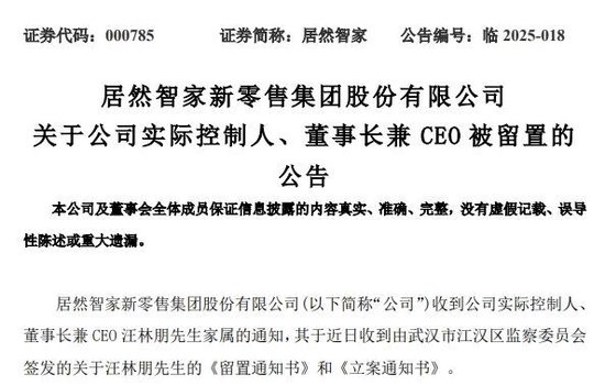 此前,4月17日晚间,居然智家(000785.SZ)发布公告称,公司收到实际控制人、董事长兼CEO汪林朋家属的通知,其于近日收到由武汉市江汉区监察委员会签发的关于汪林朋的《留置通知书》和《立案通知书》。